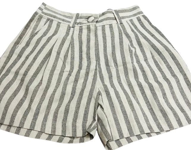 A bermuda de linho é a peça desejo de toda mulher que precisa de um visual moderno e ao mesmo tempo elegante. O modelo na cor off com listras cinzas tem pregas frontais, passante no cós para cinto que acompanha a bermuda, fecho com zíper e botão, bolsos nas laterais e cintura média.